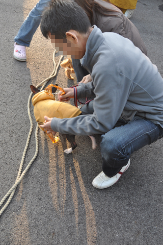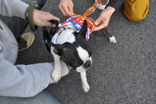 ワンコにたすきをつけて、飼い主と走るのです。