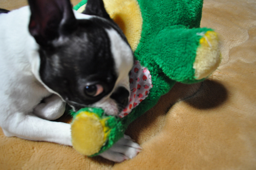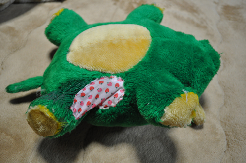 ブリーダーさんの元から一緒にやってきた緑のぬいぐるみ。