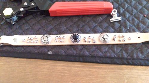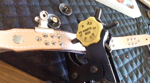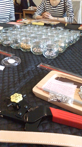 皮に穴を開けて、鋲などを仮止めしていきます!