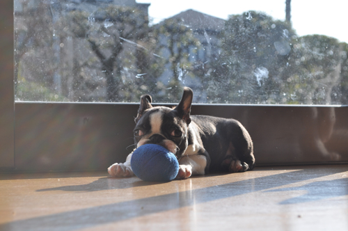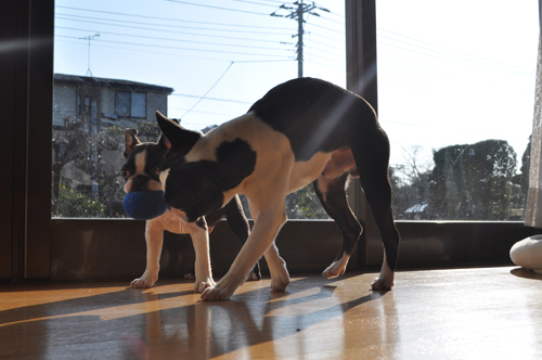 ぽかぽかろうかと、お気に入りのおもちゃかじってご満悦の那由。