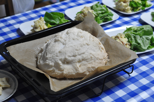 卵の白身と塩を1キロ使って、香草まぶした肉の固まりを