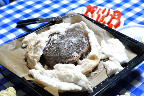 しかも案外簡単!塩と卵白混ぜたもので肉包むだけですからね〜!!