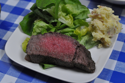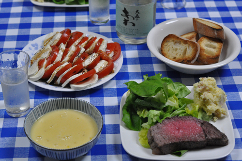 カプレーゼと、コーンスープ、マッシュポテトと塩釜焼きのステーキ!