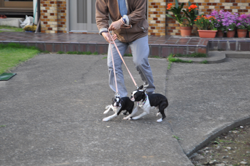 我が家はいつもこんがらがったリードでお散歩ですよ(トホホ)