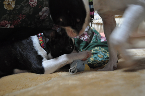 全体重をかけて、梵におもちゃを奪われるのを耐えています。