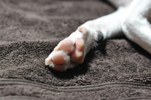 ぽんちゃんはすごく外で遊んでるから、アグレッシブカチカチの肉球っぽい!