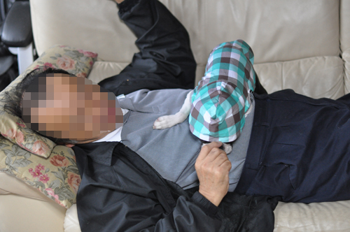 絶対に連れて行かないだろう、じぃじのおなかに逃げ込む。