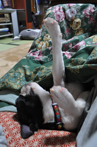先日は前足がぴんと伸びる寝相でしたが