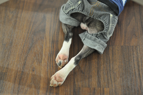 桃ちゃん、床にペッタリ寝そべって